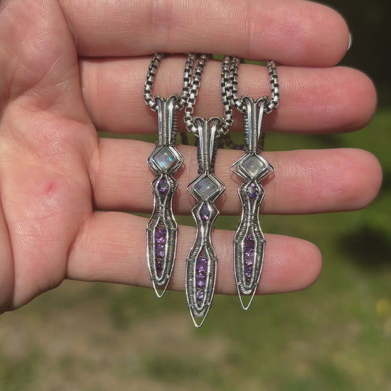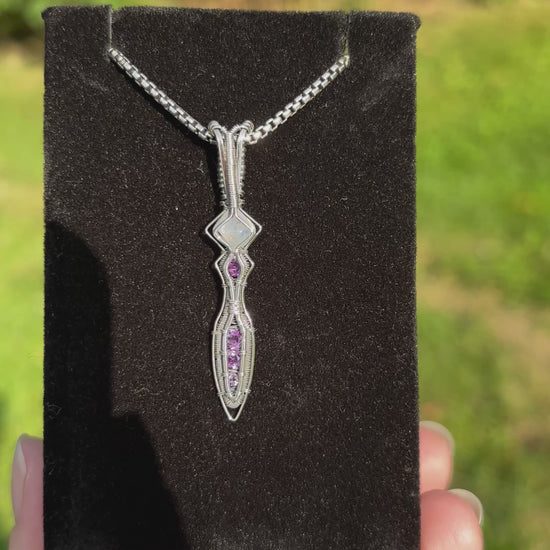 Hand crafted wire wrapped pendant featuring Rainbow Moonstone and Amerhyst in oxidized sterling silver.